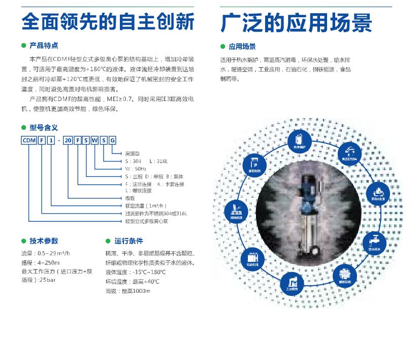 高溫泵在CDMF輕型立式多級離心泵的結構基礎上,增加冷卻裝置,可適用于最高溫度為+180攝氏度的液體。液體流經冷卻裝置到達軸封之前可冷卻至+120℃或更低,有效地保證了機械密封的安全工作溫度,同時避免高溫對電機影響損害。