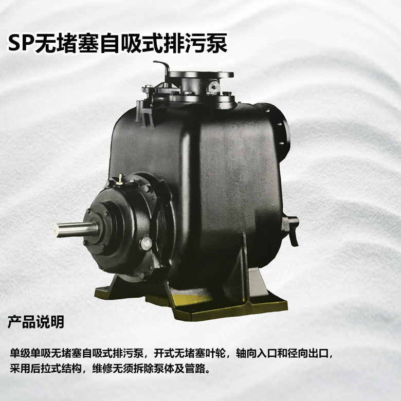 南方SP單級單吸無堵塞自吸式排污泵,開式無堵塞葉輪,軸向入口和徑向出口,采用后拉式結(jié)構(gòu),維修無須拆除泵體及管路。